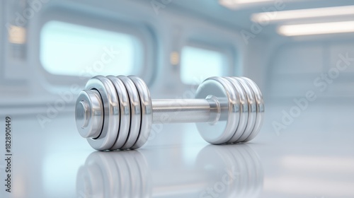 A Gleaming Stainless Steel Dumbbell Resting on a Smooth Surface in a Modern Fitness Environment with Bright Windows and Minimalist Design Elements