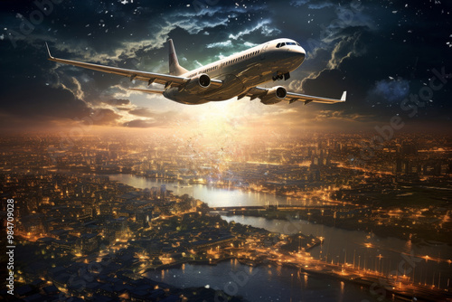 A glittering civilian aircraft flying over an urban landscape leaves a trail of condensation and an impression of freedom in the sky