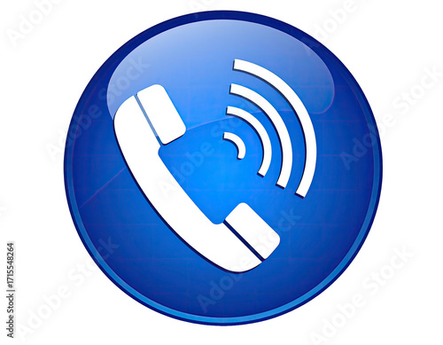 A glossy, round, blue button depicts a white telephone icon with ringing