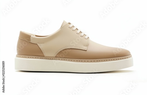 A glossy white beige shoe with fine stitching and a sophisticated design, shown in a side profile to emphasize its upscale appeal on the studio white background.
