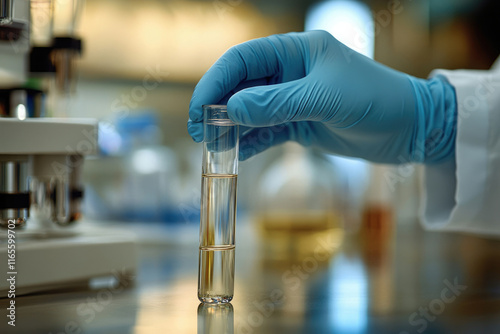 A gloved hand carefully holds a test tube containing two distinct liquid layers, suggesting a scientific experiment or analysis.
