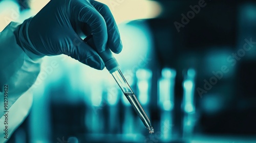 A gloved hand holds a pipette, indicating laboratory work in a scientific setting.