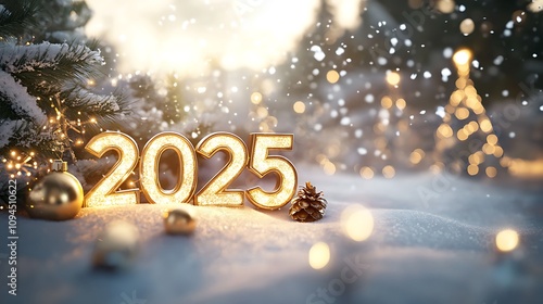 A glowing 3D "2025" in gold, surrounded by twinkling Christmas lights, soft snowflakes gently falling, warm ambient lighting, with a festive winter scene in the background, new year eve