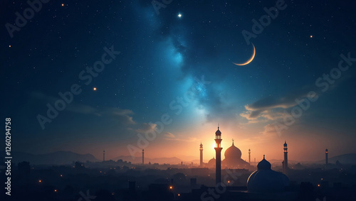 A Glowing Beacon of Faith: Golden Lanterns and Crescent Moon in Ramadan