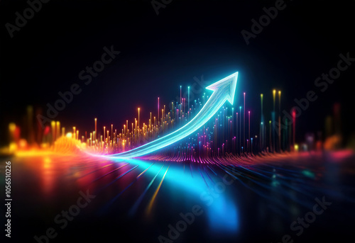 A glowing blue arrow ascends against a backdrop of colorful lights, symbolizing growth and progress.