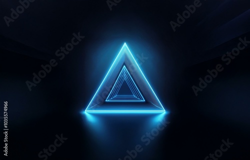 A glowing blue neon triangle with a reflective surface sits in a dark, empty room.