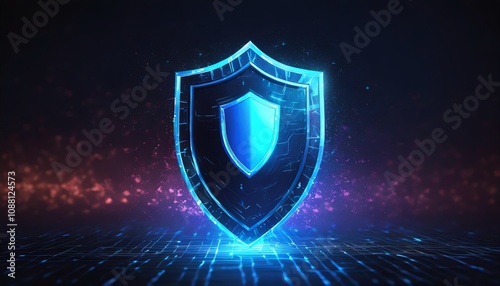 A glowing blue shield symbolizing digital security against cyber threats in a futuristic, dark environment.