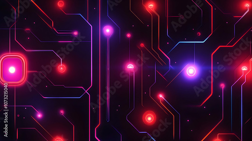 A glowing circuit board design with radiant pink, purple, and blue nodes connected by illuminated pathways.