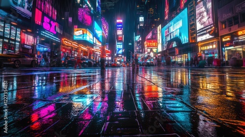A glowing futuristic city at night with wet streets, neon billboards, and vibrant reflections in a cyberpunk world