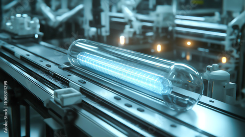 A glowing futuristic transparent capsule moving along an automated conveyor belt in a high-tech factory. The capsule manufacturing process