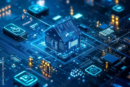 A glowing house model sits on an intricate circuit board