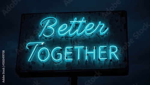 A glowing light bulb shining on a monochromatic signboard with the phrase 'Better Together' during night