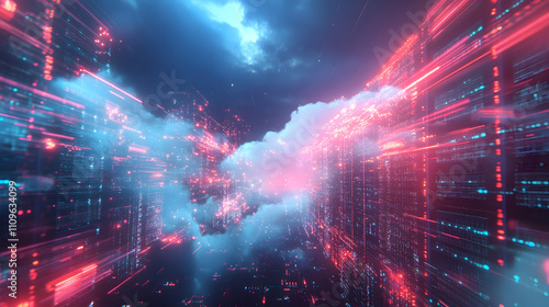 A glowing pink and blue cloud surrounded by digital trails, symbolizing futuristic data streams and cloud technology.