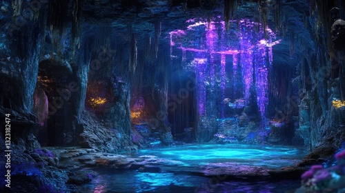 A glowing subterranean cavern with illuminated water and rock formations