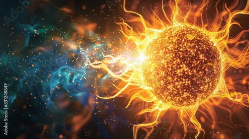A glowing yellow sun is surrounded by blue and purple sparks