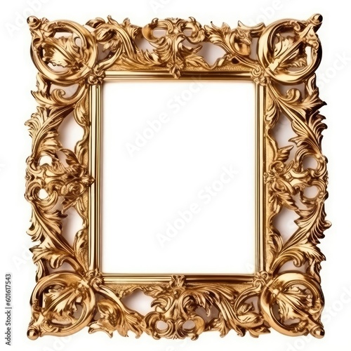 A gold ornate frame isolated on a white background for displaying or decorating purposes. (Generative AI)