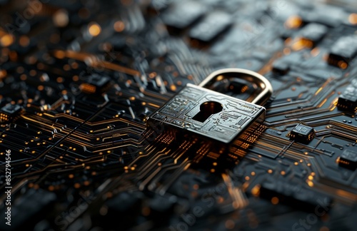 A gold padlock secures a computer motherboard, symbolizing cybersecurity and data protection.