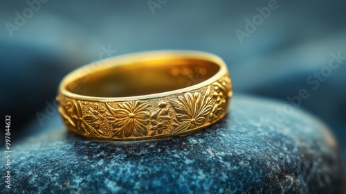 A gold ring with delicate engravings, displayed on a smooth stone.