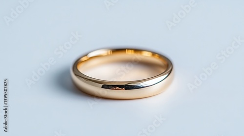 A gold wedding ring resting on a smooth white surface, showcasing its elegant simplicity and polished finish, and close-up composition.