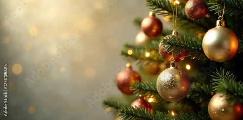 A golden and silver Christmas tree with ornaments and lights, branch, backdrop, festive