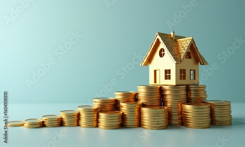 A golden house miniature sits atop a rising stack of gold coins, symbolizing wealth and financial prosperity in real estate. A concept of success and investment.