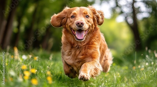 A golden retriever happily sprints through a vibrant field on a sunny afternoon