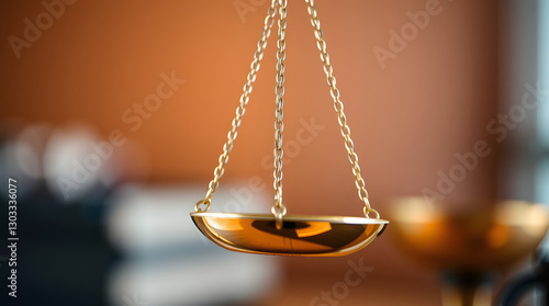 a golden scale symbolizing justice and fairness, set against a blurred backdrop of law books. This image evokes the concepts of law, order, and ethical decision-making
