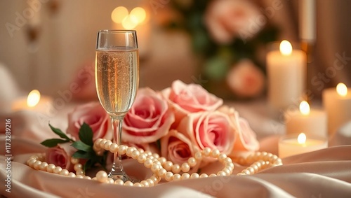 A gold-rimmed champagne flute filled with bubbly, surrounded by pearls and fresh roses resting on silk fabric, soft focus background, Valentine Day Banner