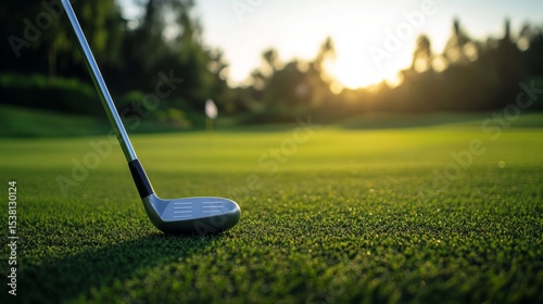 A golf club in mid-swing, photographed against a green fairway and a distant flag, capturing the motion of the club with a blurred background.
