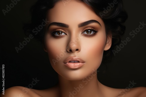 A gorgeous European model woman with cosmetic makeup enhances the beauty of a caucansian model in a captivating close-up portrait against a dark black background.