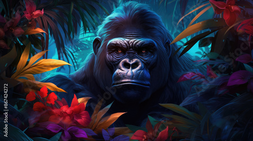 A gorilla male with powerful shoulders. Close-up portrait of gorilla in tropical flowers and leaves. Picturesque portrait Wildlife animal. Digital illustration, generative ai