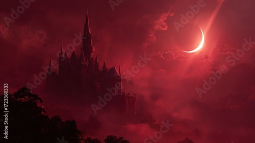 A gothic castle silhouette against a crimson sky with a crescent moon and sun rays