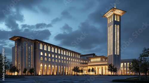 A grand mosque with a tall minaret lit up at night, with people walking in front of it.