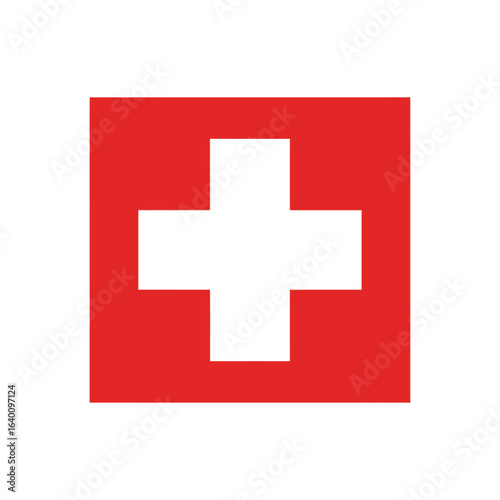 A graphic illustration of the national flag of Switzerland, featuring a white cross on a red square field.