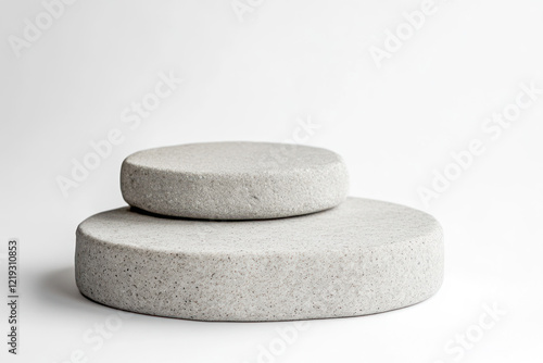 a gray stone podium on a white background, in an aesthetic style with a simple and minimalistic design, and soft lighting to highlight the texture of the rough stones.