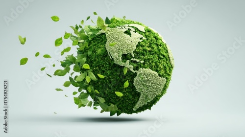A green and white globe with a map of the Americas on it, surrounded by leaves, floating in the air against a light blue background.