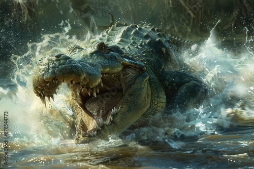 A green crocodile leaps out of the water, its powerful jaws open and ready to strike.