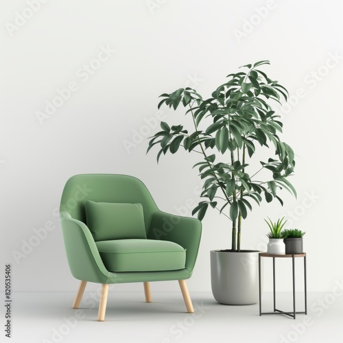 A green modern armchair with a pillow in a bright room, next to a table and indoor plants, minimal interior.