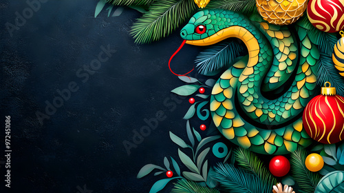 A green snake coiled near a Christmas tree adorned with red ornaments on a dark blue background, symbolizing the New Year in a festive setting. Copy space.