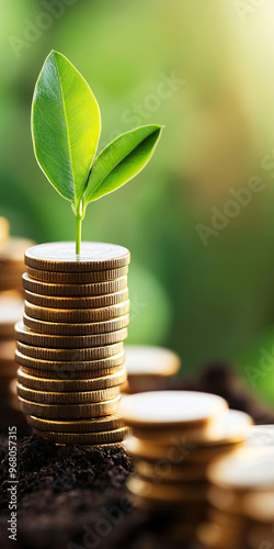 A green sprout growing from a stack of coins symbolizes growth, prosperity, and the relationship between nature and finance.
