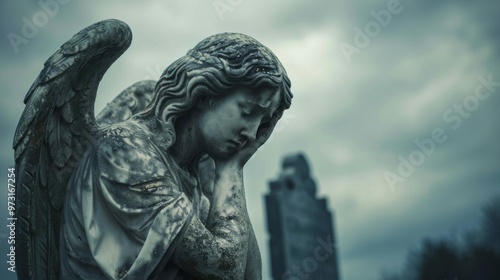 A grieving angel statue with a bowed head, surrounded by faded gravestones, under a cloudy sky creating a moody atmosphere.