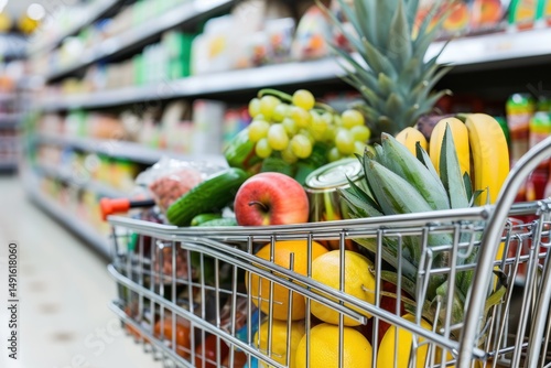 A grocery cart filled with a variety of fruits and vegetables, including apples, bananas, oranges, and lemons, in a supermarket setting.