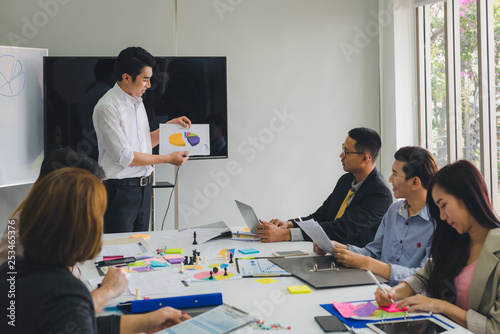 A group of Asian businessmen are discussing. Employees are presenting their work to the meeting.