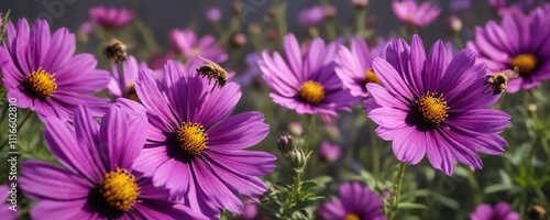 A group of bees surrounding a large, showy purple cosmos flower, pollen gathering, nature's wonders, floral arrangement
