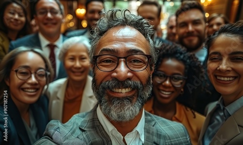 A group of business people are capturing a fun group selfie shot together, smiling and enjoying their moment.