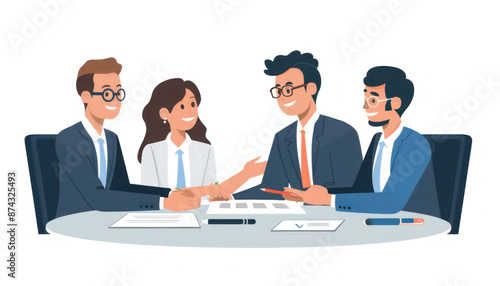 A group of business people in formal wear are gathered around a table for a meeting