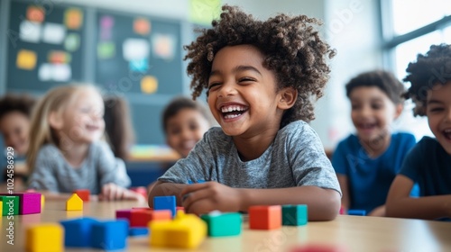 A group of children are playing with blocks and one of them is smiling