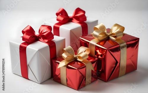 A group of christmas presents wrapped in white and red paper with red and gold ribbons, isolated on white background, creating a festive and celebratory scene