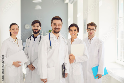 A group of confident practicing doctors in white coats are smiling against the backdrop of the clinic.