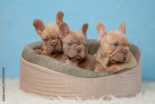 A group of cute French bulldog puppies in an animal bed on a blue background looks at the camera